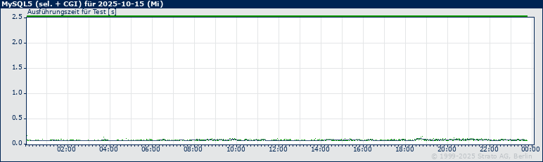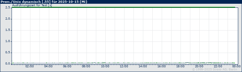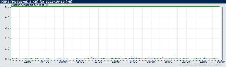 Am 2025-10-15 traten keine Timeouts/Fehler auf. Antworten, die erst nach 10 oder mehr Sekunden eingetroffen sind, sind auf der oberen X-Achse durch eine orange, Timeouts oder Fehler als graue Markierung hervorgehoben. Timeouts sind zusätzlich als vertikale graue Linie im Graph dargestellt.