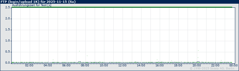Im folgenden Graph geben blaue Punkte geben die Antwortzeit bei den einzelnen Messungen an, eine mehr order weniger horizontal verlaufende, graue Linie zeigt den gleitenden Durchschnitt für 15 Minuten an. Ein Pixel in der Fläche des Graphen (weiß) entspricht zwei Minuten bzw. Messungen.