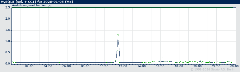 Im folgenden Graph geben blaue Punkte geben die Antwortzeit bei den einzelnen Messungen an, eine mehr order weniger horizontal verlaufende, graue Linie zeigt den gleitenden Durchschnitt für 15 Minuten an. Ein Pixel in der Fläche des Graphen (weiß) entspricht zwei Minuten bzw. Messungen.