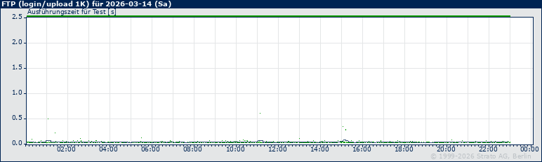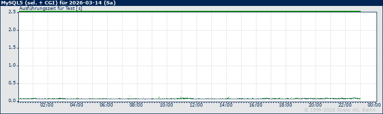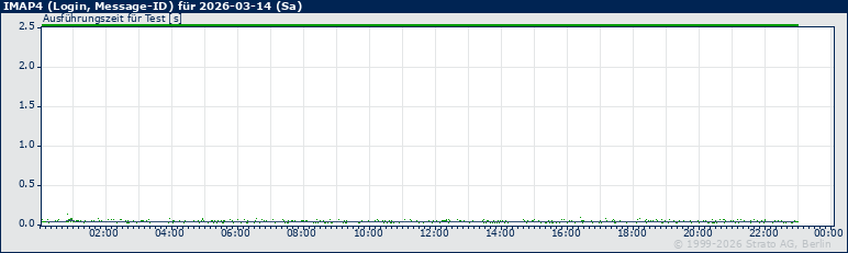 Im folgenden Graph geben blaue Punkte geben die Antwortzeit bei den einzelnen Messungen an, eine mehr order weniger horizontal verlaufende, graue Linie zeigt den gleitenden Durchschnitt für 15 Minuten an. Ein Pixel in der Fläche des Graphen (weiß) entspricht zwei Minuten bzw. Messungen.