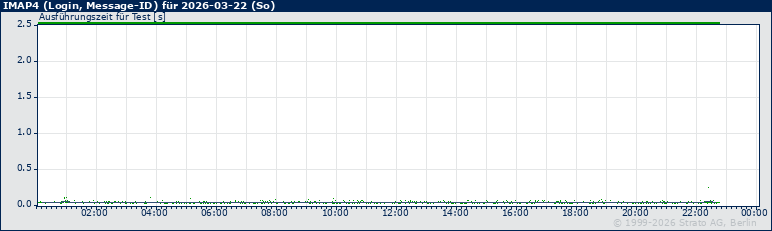 Im folgenden Graph geben blaue Punkte geben die Antwortzeit bei den einzelnen Messungen an, eine mehr order weniger horizontal verlaufende, graue Linie zeigt den gleitenden Durchschnitt für 15 Minuten an. Ein Pixel in der Fläche des Graphen (weiß) entspricht zwei Minuten bzw. Messungen.