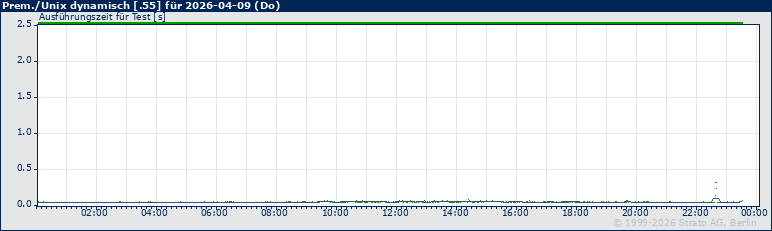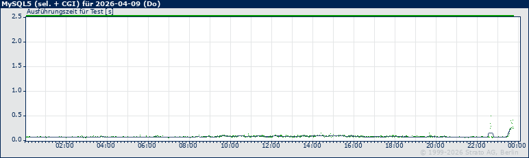 Im folgenden Graph geben blaue Punkte geben die Antwortzeit bei den einzelnen Messungen an, eine mehr order weniger horizontal verlaufende, graue Linie zeigt den gleitenden Durchschnitt für 15 Minuten an. Ein Pixel in der Fläche des Graphen (weiß) entspricht zwei Minuten bzw. Messungen.