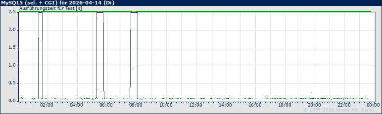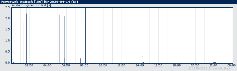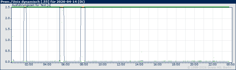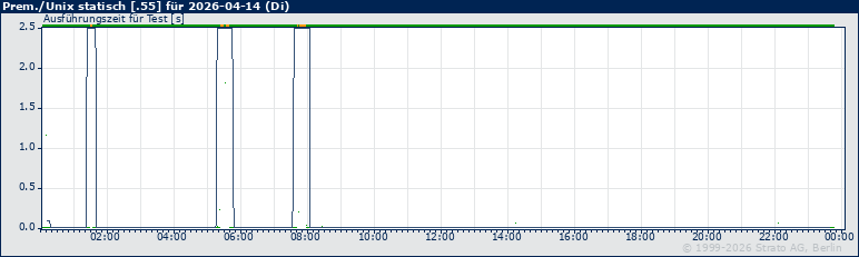 Am 2026-04-14 traten keine Timeouts/Fehler auf. Antworten, die erst nach 10 oder mehr Sekunden eingetroffen sind, sind auf der oberen X-Achse durch eine orange, Timeouts oder Fehler als graue Markierung hervorgehoben. Timeouts sind zusätzlich als vertikale graue Linie im Graph dargestellt.
